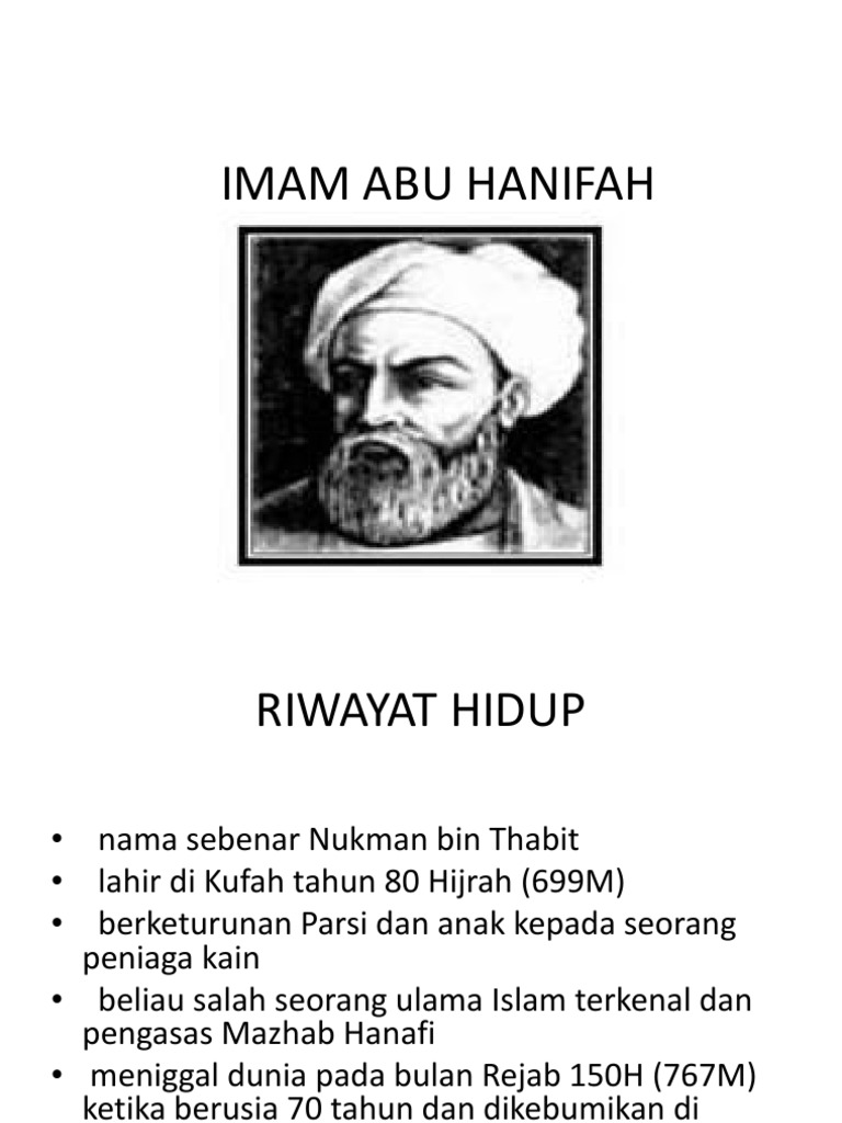 Para Imam Mahab seperti Imam Abu Hanifah Imam Syafii dan Imam Ahmad. BIODATA NURMAN BIN TABIT RA. Nama lengkapnya adalah Imam Abu Hanifah Numan bin Tsabit lahir tahun 80 H di kota Kufah pada masa pemerintahan dinasti Bani Umayyah.